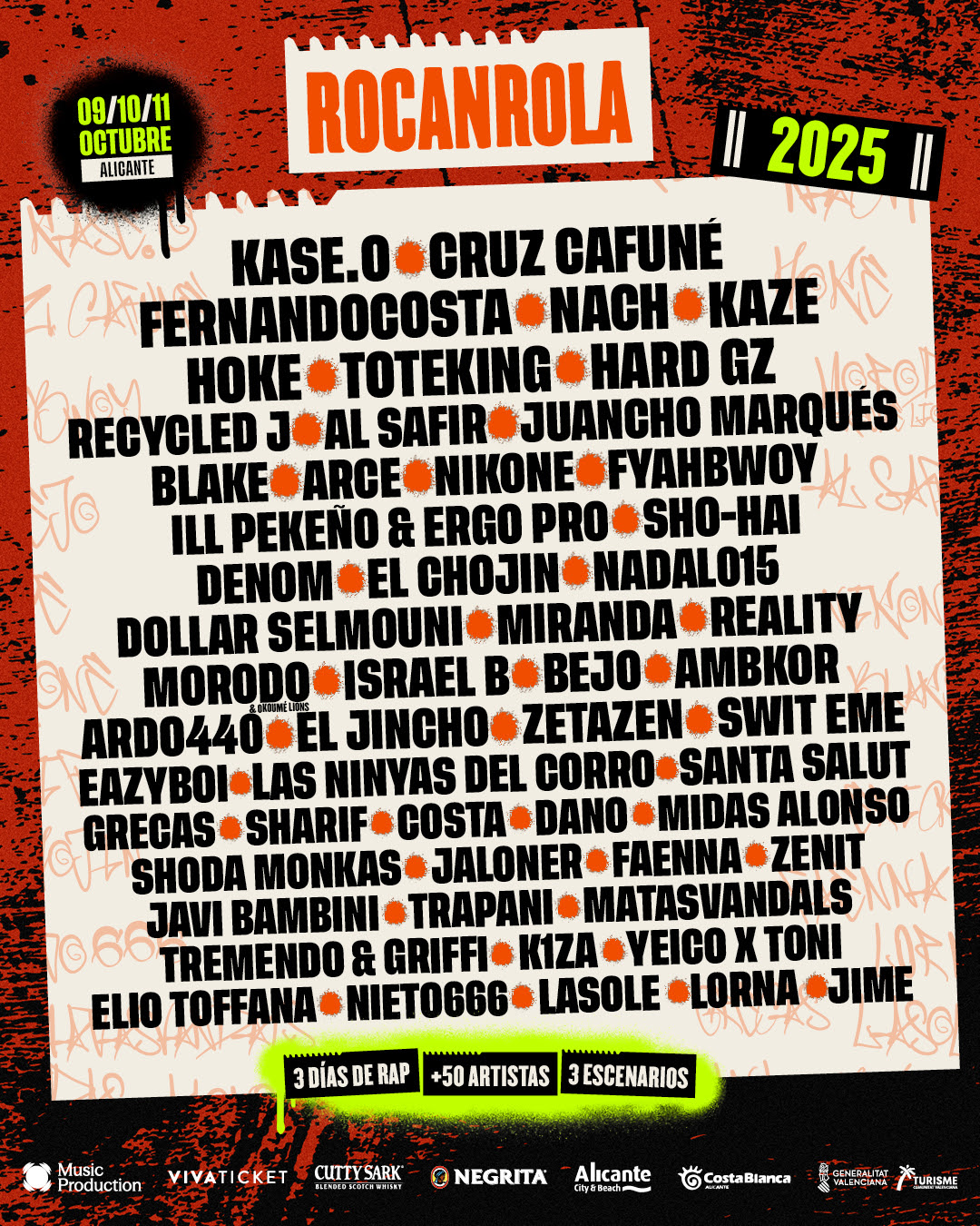 Durante tres días, la ciudad vibrará al ritmo de los nombres más importantes del rap nacional como Kase.O, Toteking, Nach, Sho-Hai, El Chojin, Morodo, además de nuevas voces que lideran la actualidad del género como Cruz Cafuné, Fernandocosta, Recycled J, Hoke, Juancho Marqués, Bejo, Dollar Selmouni, Hard GZ y muchos más.